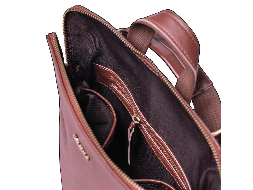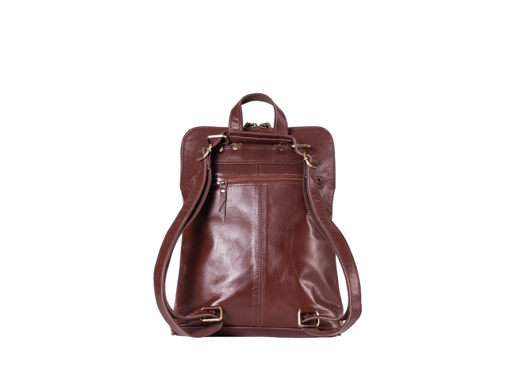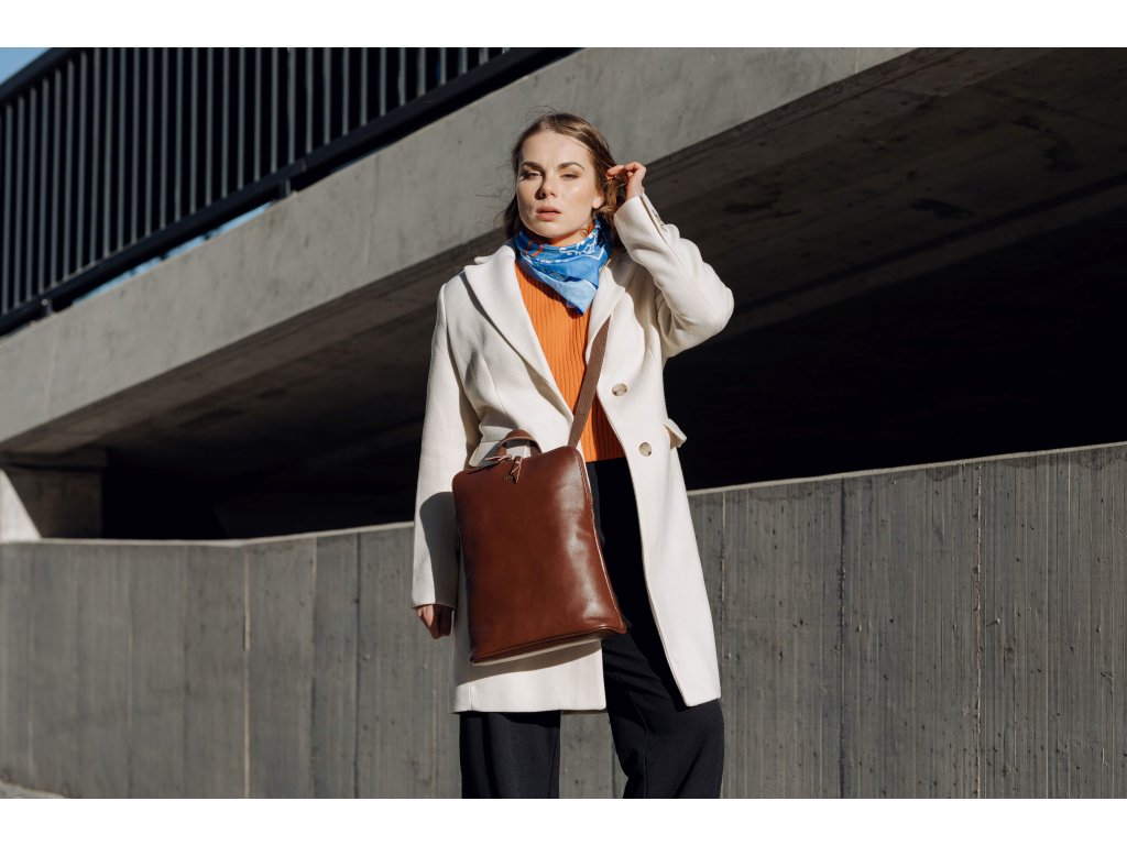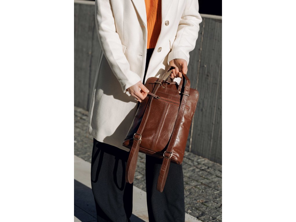 Ráno elegantní kabelka a odpoledne pohodlný batoh? To je Daniela! Tento batůžek 2 v 1 je ručně vyrobený z pravé kozí kůže v přírodním hnědém odstínu a jeho detaily tvoří staromosazné kování. Popruh, díky kterému se kabelka v mžiku mění na batoh a naopak, jsme podšili bavlněnou tkaninou pro ještě pohodlnější nošení. Uvnitř kabelko - batohu Daniela najdete dvě hladké kapsy a jednu na zip, další uzavíratelnou jsme schovali zvenku na záda. Do hlavní kapsy o rozměrech 27 x 34 cm se vejde nejeden model notebooku.