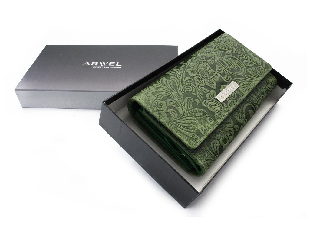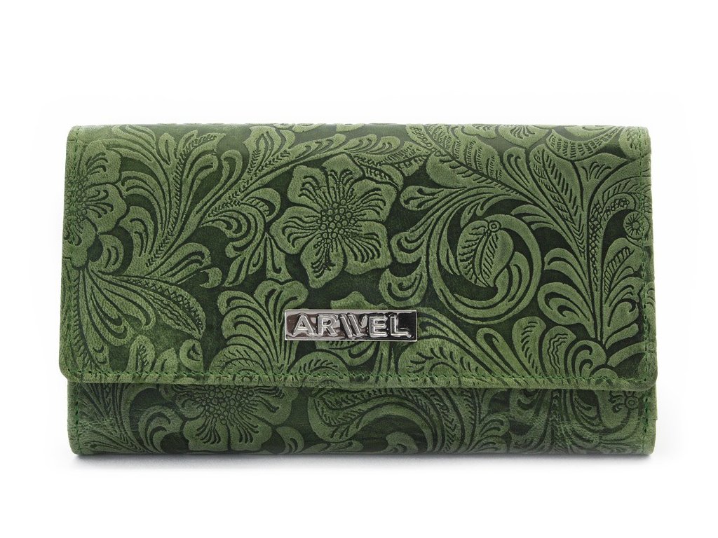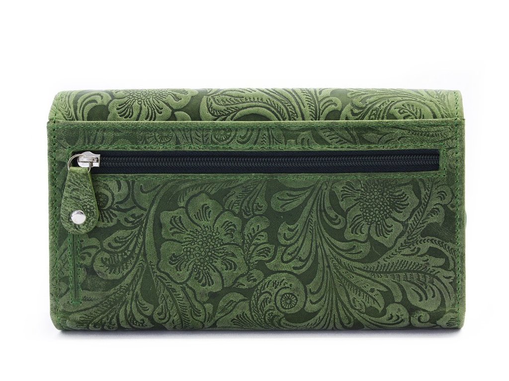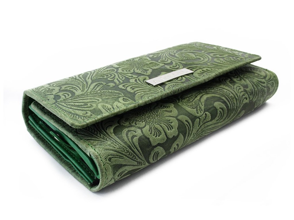 Atraktivní dámská kožená peněženka Adina obsahuje 2 přihrádky na bankovky a vnitřní rozdělenou zipovou kapsu na mince. Dále má 12 kapes na platební karty či doklady, 5 otevřených kapes a 3 průhledná okna. Na zadní vnější straně je zipová kapsa. Peněženka Adina má zapínání na klopnu s ozdobným kováním jištěnou drukem.