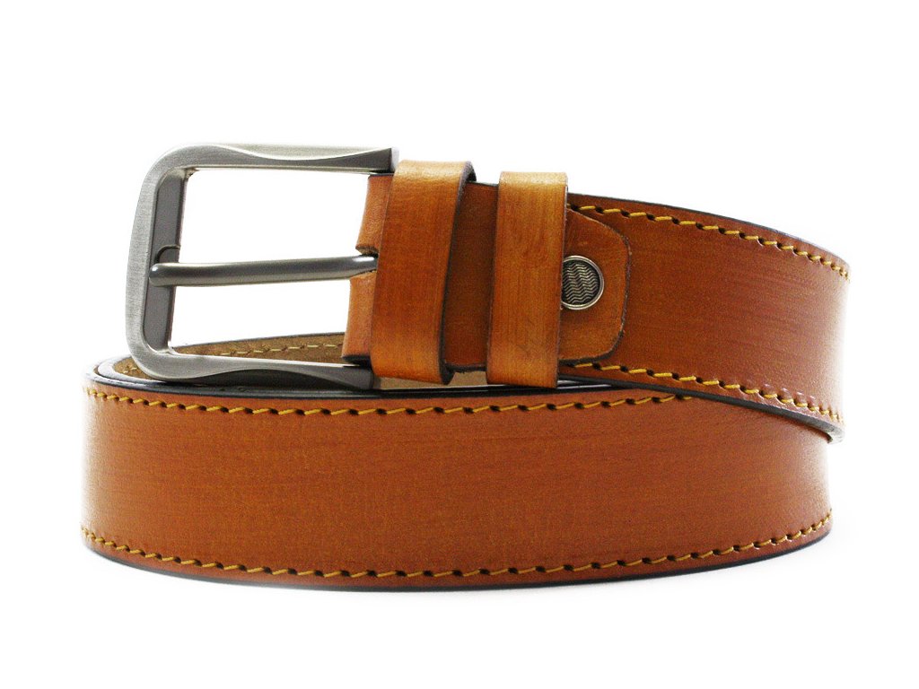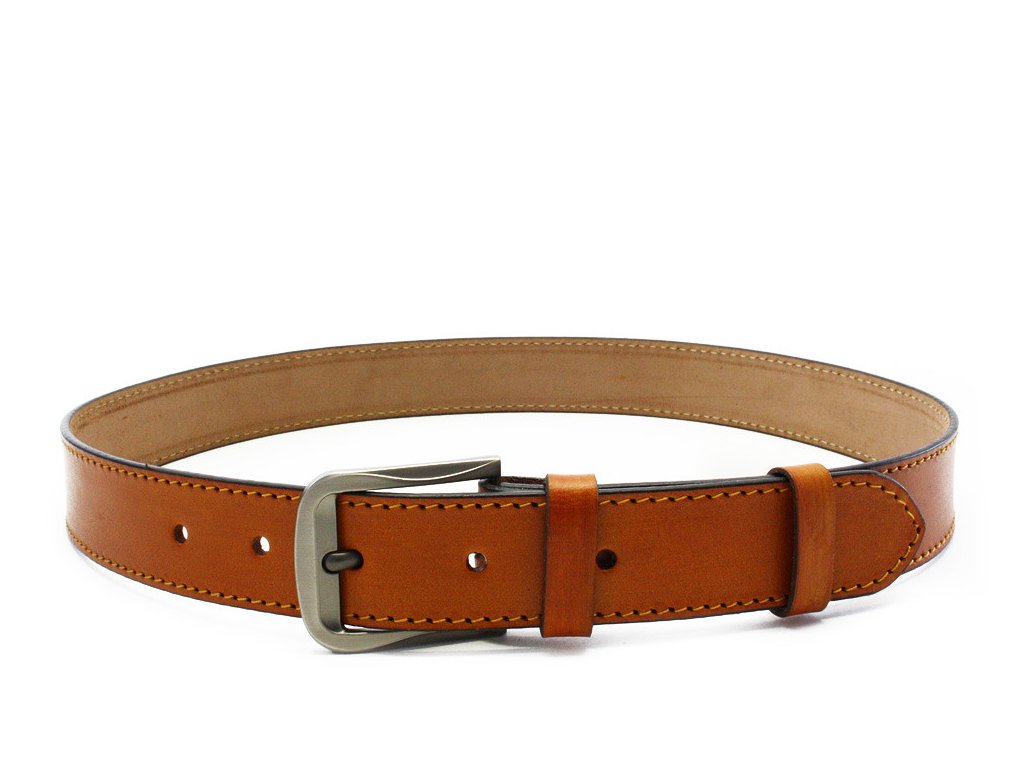 Elegantní pánský kožený opasek Tiberius ze světle hnědé pravé hovězí kůže se šířkou 3,8 cm a tmavě stříbrnou matnou...