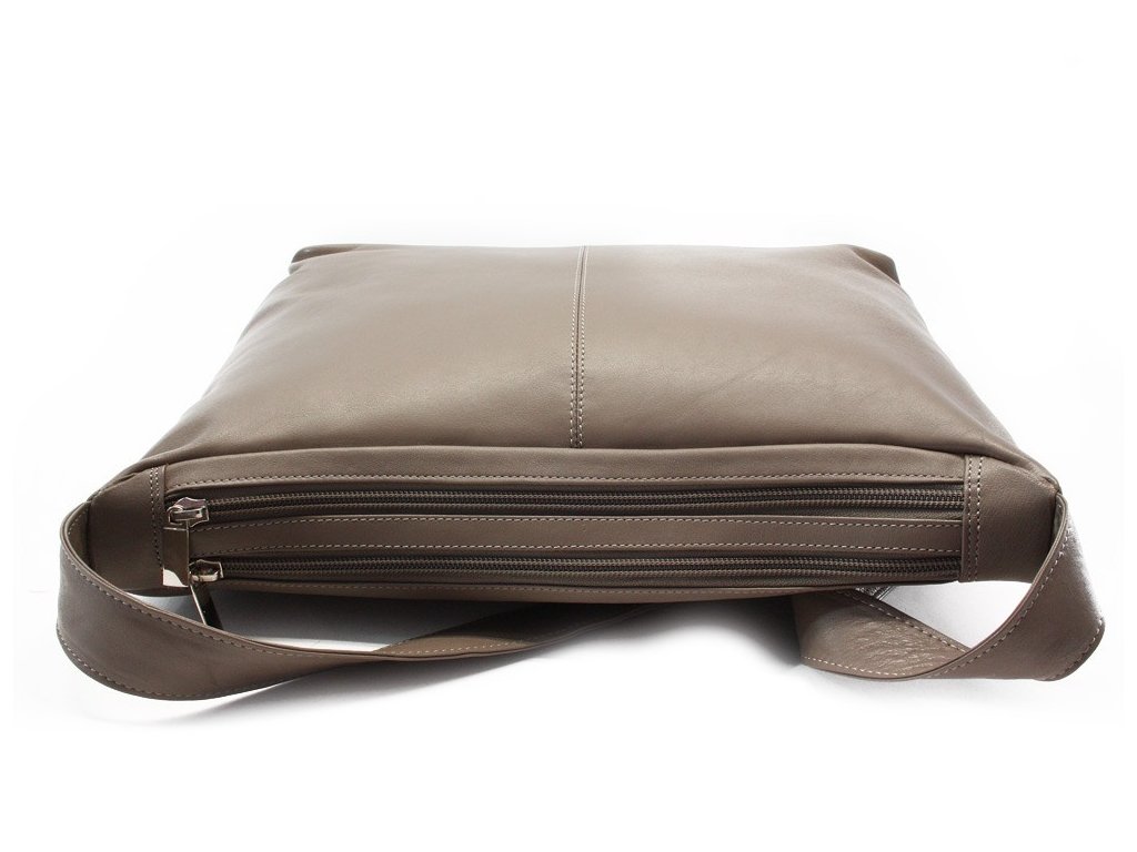 Kožená dvouzipová kabelka s širokým popruhem má 2 zipové separace, vnitřní zipovou kapsu, kapsu na mobil, odepínatelný kroužek na klíče a malé zrcátko v koženém obalu. Má také venkovní dlouhou kapsu pro skládací deštník. Délka popruhu je 80 cm.