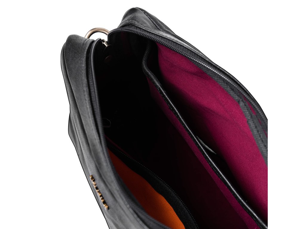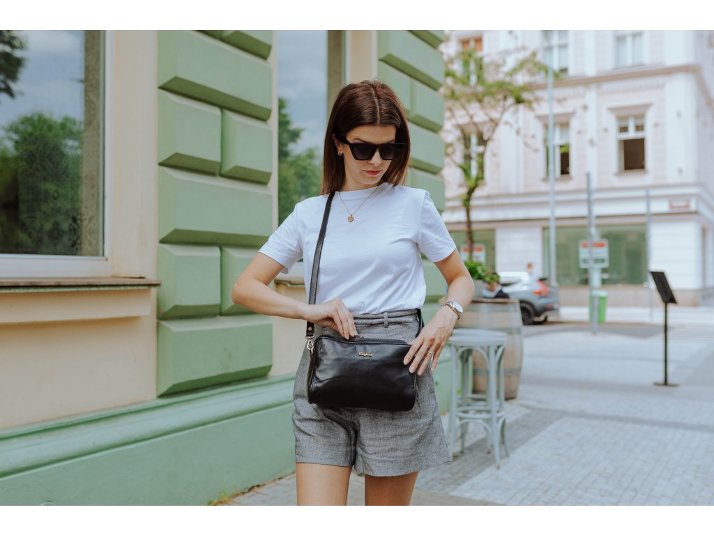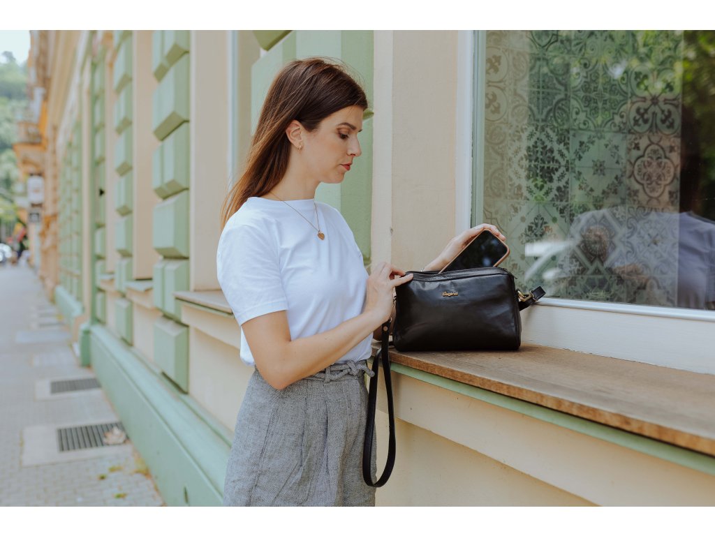 Městská crossbody kabelka z pravé kůže v černé barvě. Uvnitř najdete dvě menší kapsičky a elegantní podšívku. Gabriela bude vaše nejlepší přítelkyně na procházkách po městě, kdy potřebujete jen to nejdůležitější. Díky nastavitelnému popruhu padne opravdu každé.